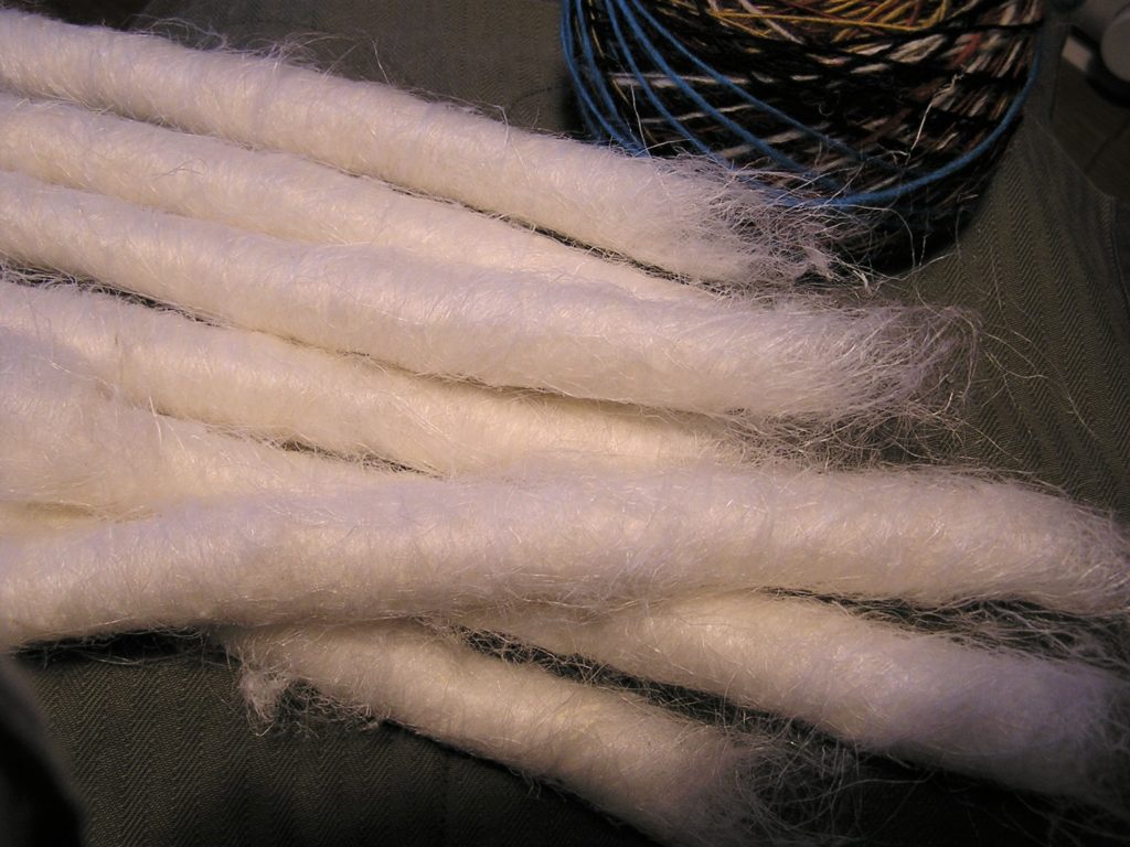 織機に残った糸を継いだ毛糸とリネン糸と撚り合わせて
