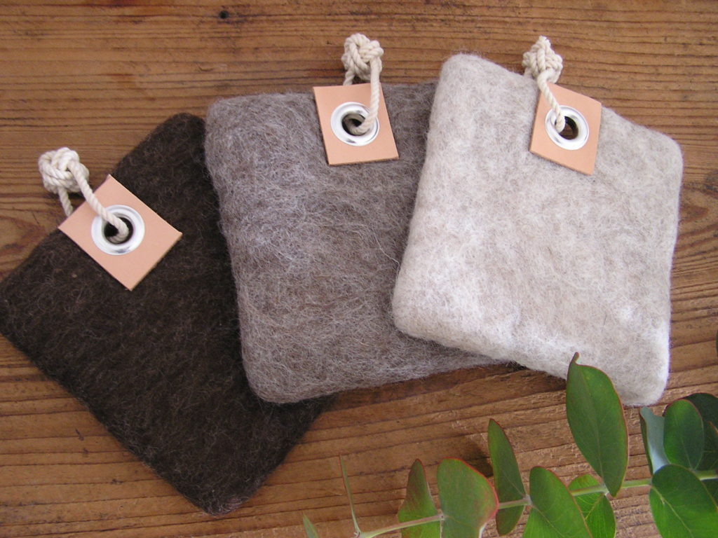 羊毛フェルト、ハトメ、革、ロープの組み合わせ。