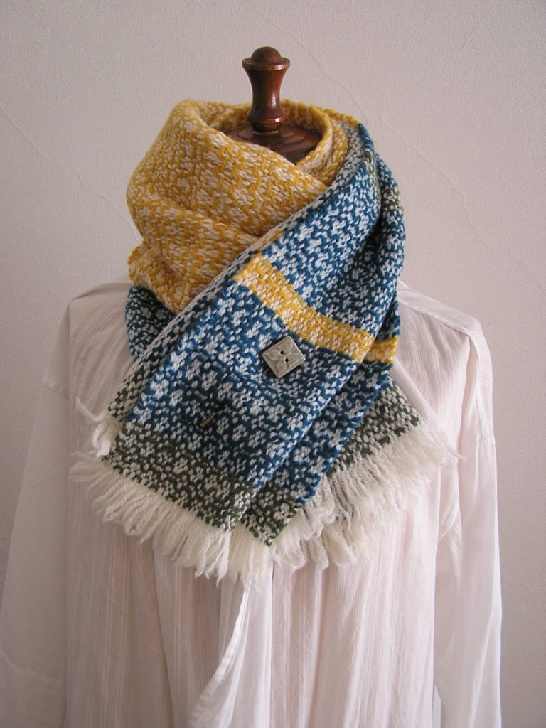 ストール, ホームスパン2022 ショートストール からし色×アクアマリン a-skip2022年11月4日 陶ボタンピン付き 半分の幅に折って後ろで交差し、前で重ねてピンで留める。 被るタイプ(スヌード)の巻き物が苦手なかたに。 Creemaに掲載しました。 a-skip 投稿を作成しました 1101